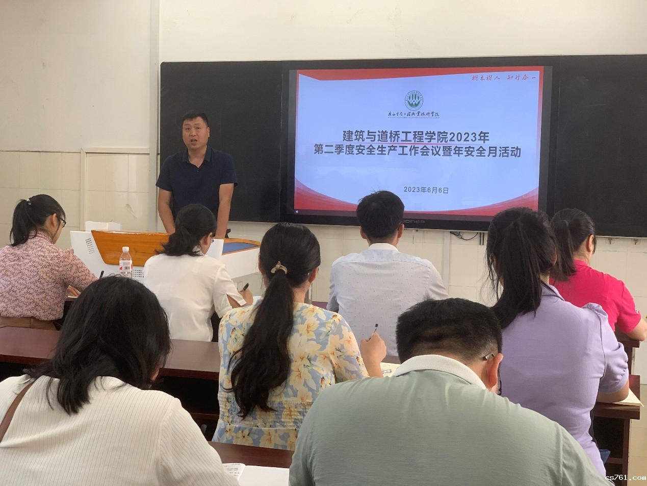 2023年6月6日,建工学院在西2教学楼314召开第二季度安全生产工作会议暨安全月活动,全体教师参会,会议由学院副院长刘冶敏主持。