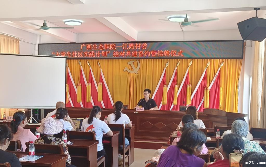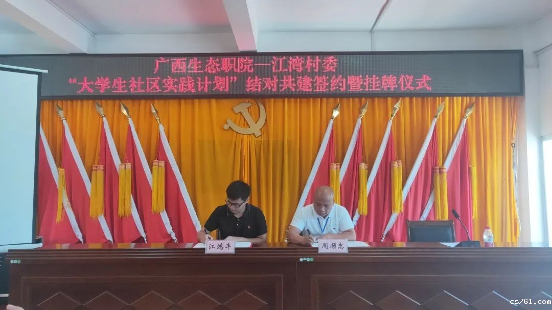签约仪式上,双方就各自领域介绍了基本情况,并就共建目标、内容、形式等进行深入交流,充分利用当代大学生的价值促进交流合作,增加青年走进基层、服务社会的机会。江湾村党总支书记周顺忠表示,今后将围绕江湾村精神文明建设方面,广泛开展特色鲜明、形式多样的结对共建活动,让志愿服务精准解决群众需求。广西生态职院团委书记江鸿丰表示,此次大学生社区实践基地的顺利落成,是全面提升大学生综合素质的有力举措,要结合学校实际,通过校社联动、队伍共建、服务联动,项目化开展大学生基层实践活动,持续加强大学生思想政治教育,切实提升社会实践能力,促进其全面发展。