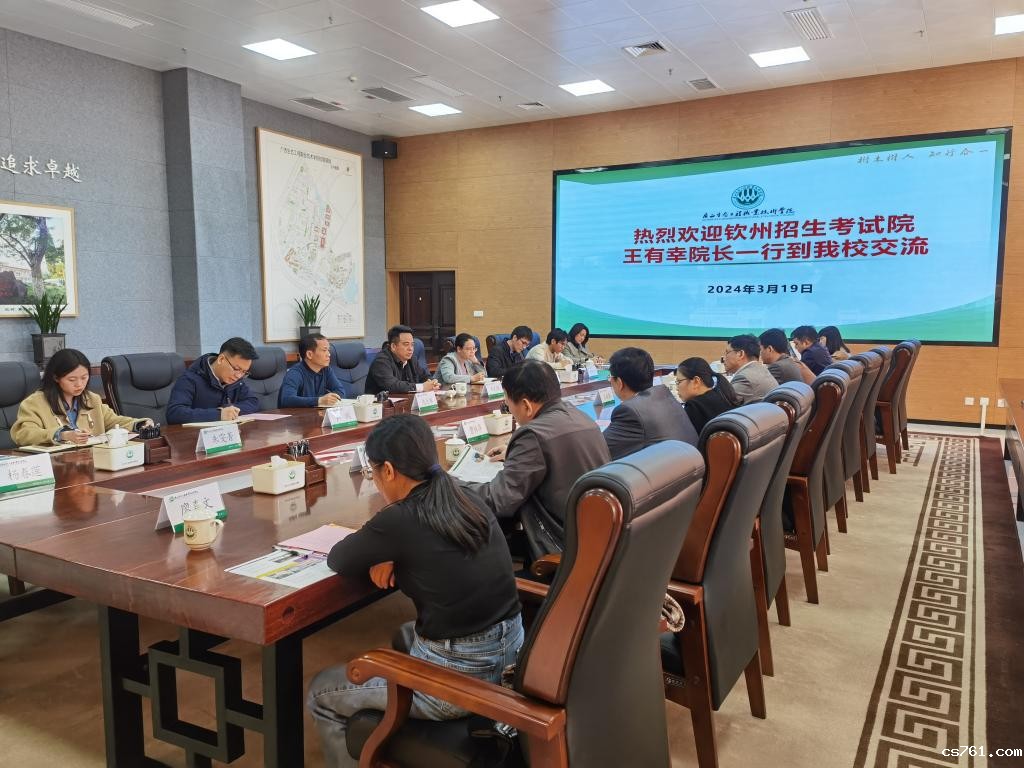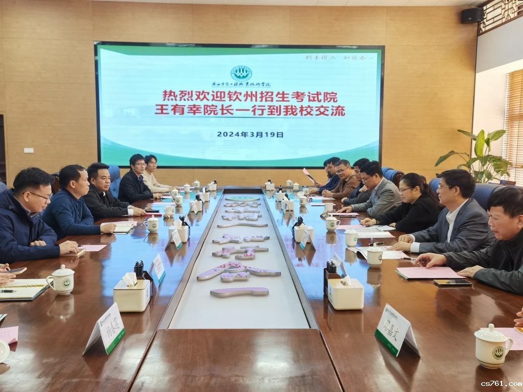 3月19日下午钦州招生考试院院长王有幸一行14人到我校进行调研交流,在一棵树会议室召开钦州招生工作交流会议。学校校长助理韦文榜、招生就业处处长龙大军、建筑与道桥工程学院院长肖万娟以及钦州各片区招生负责人参加了会议。