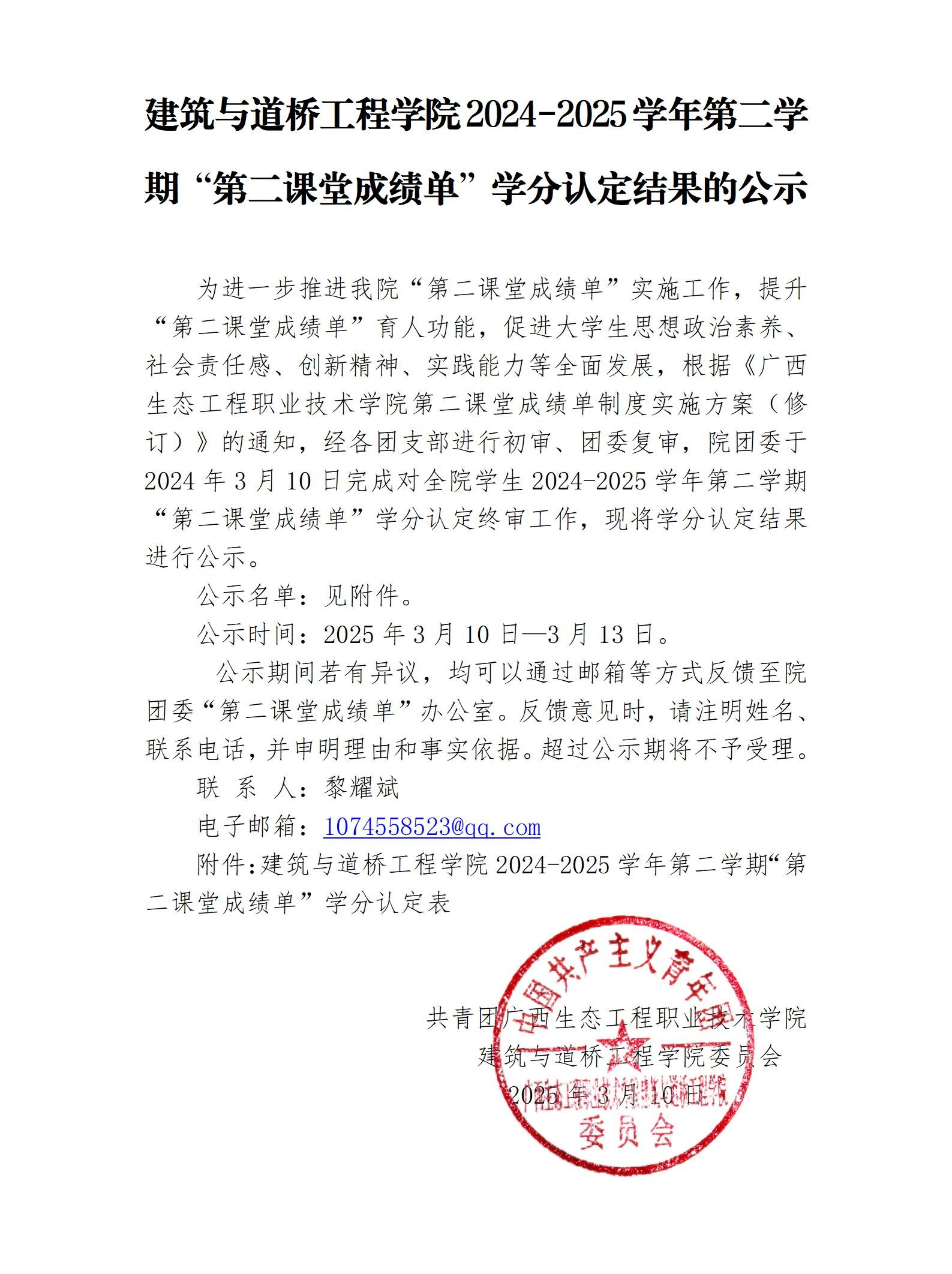 建筑与道桥工程学院2024-2025学年第二学期“第二课堂成绩单”学分认定结果的公示