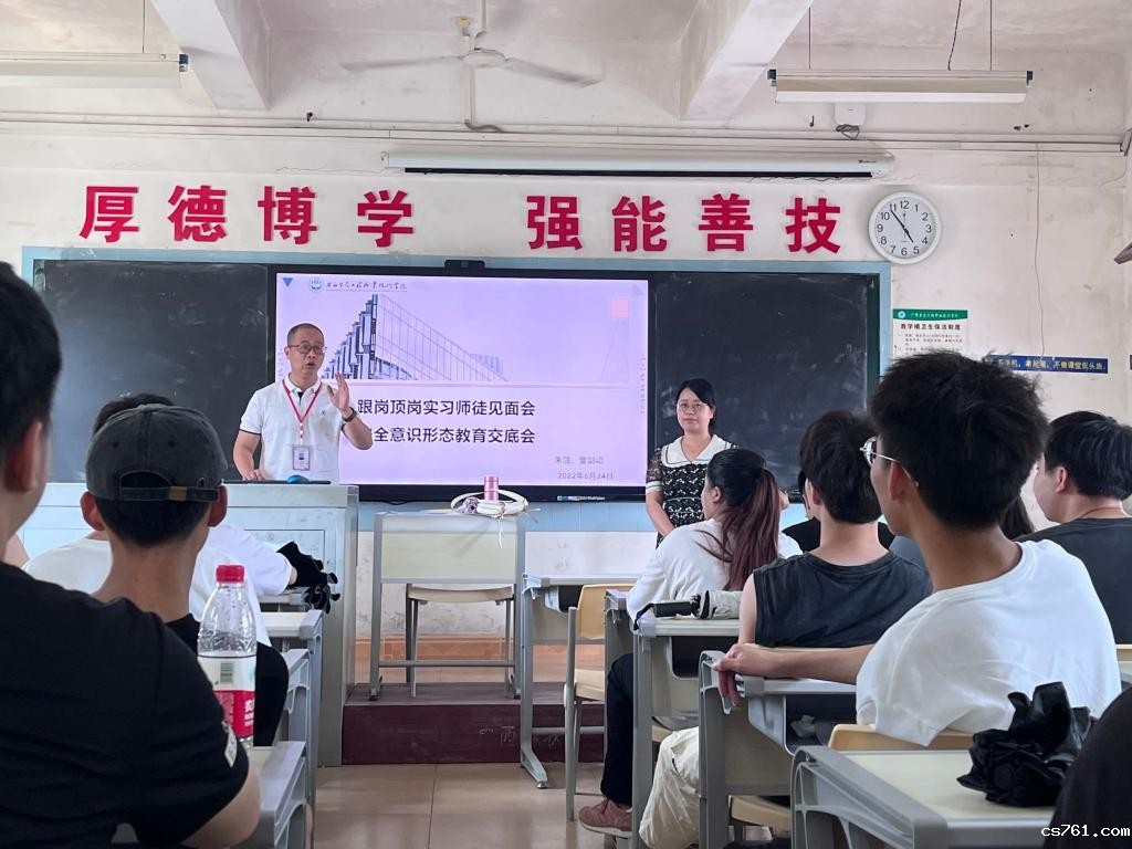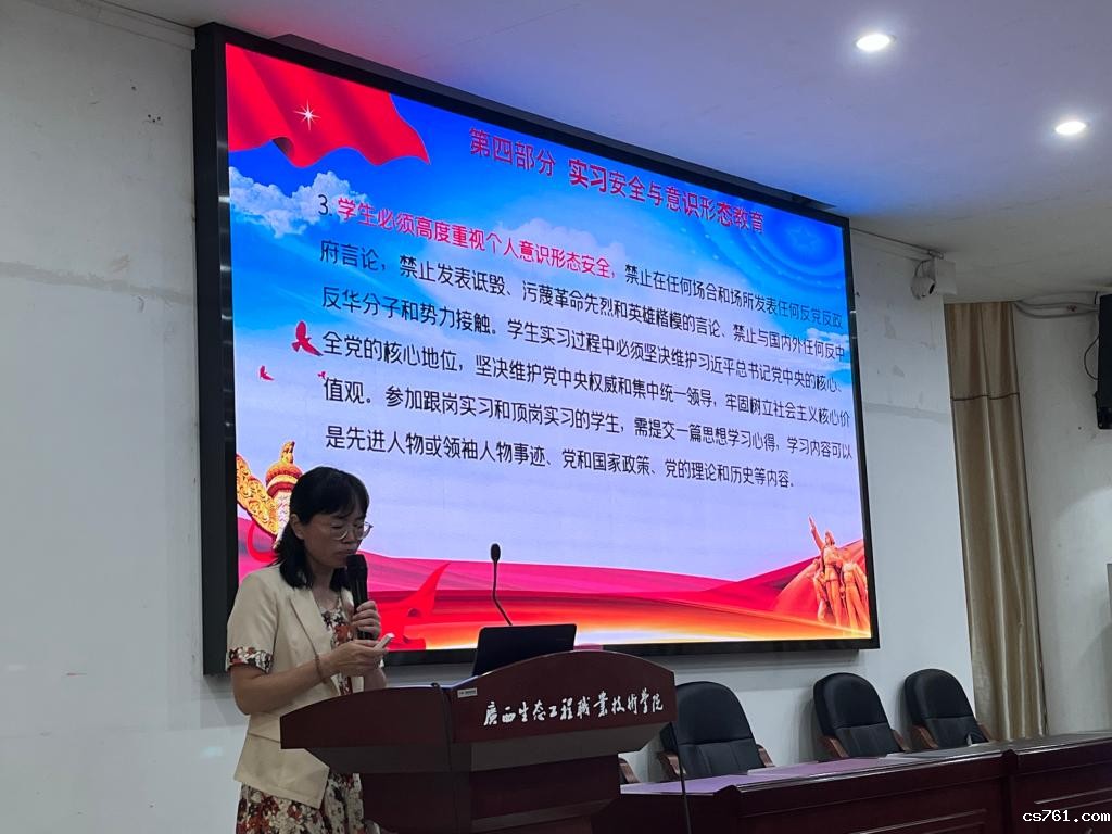 会上,覃老师着重从实习形式、实习要求、实习安全与意识形态教育、期待四个方面展开讲解,给即将走上岗位的20级造价专业学生上了一堂富有感染力的课堂。特别是针对专业岗位存在的危险性强调了实习“安全三条”(即①实习期间,禁止到酒吧、夜总会等营业性娱乐场所开展顶岗实习。②实习期间,严禁参与传销、赌博、色情活动;严禁酗酒吸毒、寻衅滋事、打架斗殴;规范用电,严禁乱拉、乱接电源线;不与陌生人交往;不为贪图便宜与流窜商贩做生意;严禁到江、河、湖、海、水库等处游泳;讲究卫生,不随意到外面就餐。③出行要严格遵守交通规则,不乘坐无牌无证车船;外出游玩必须征得指导教师的书面同意,并有三人及以上结伴同行,回到住地后要及时向指导教师汇报。)同学们表示安全三条很好记忆,一定认真执行,提高安全防范意识,确保人身、财产安全。此外覃老师还说到,学生必须高度重视个人意识形态安全,禁止在任何场合和场所发表任何反党反政府言论,禁止发表诋毁、污蔑革命先烈和英雄楷模的言论、禁止与国内外任何反中反华分子和势力接触。必须坚决维护习近平总书记党中央的核心、全党的核心地位,坚决维护党中央权威和集中统一领导,牢固树立社会主义核心价值观。最后覃老师对大家提出的殷切期待和祝福。会后,各班指导老师还召开了师徒见面会,进一步讲解实习管理规定及安全问题。