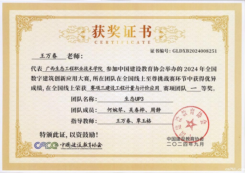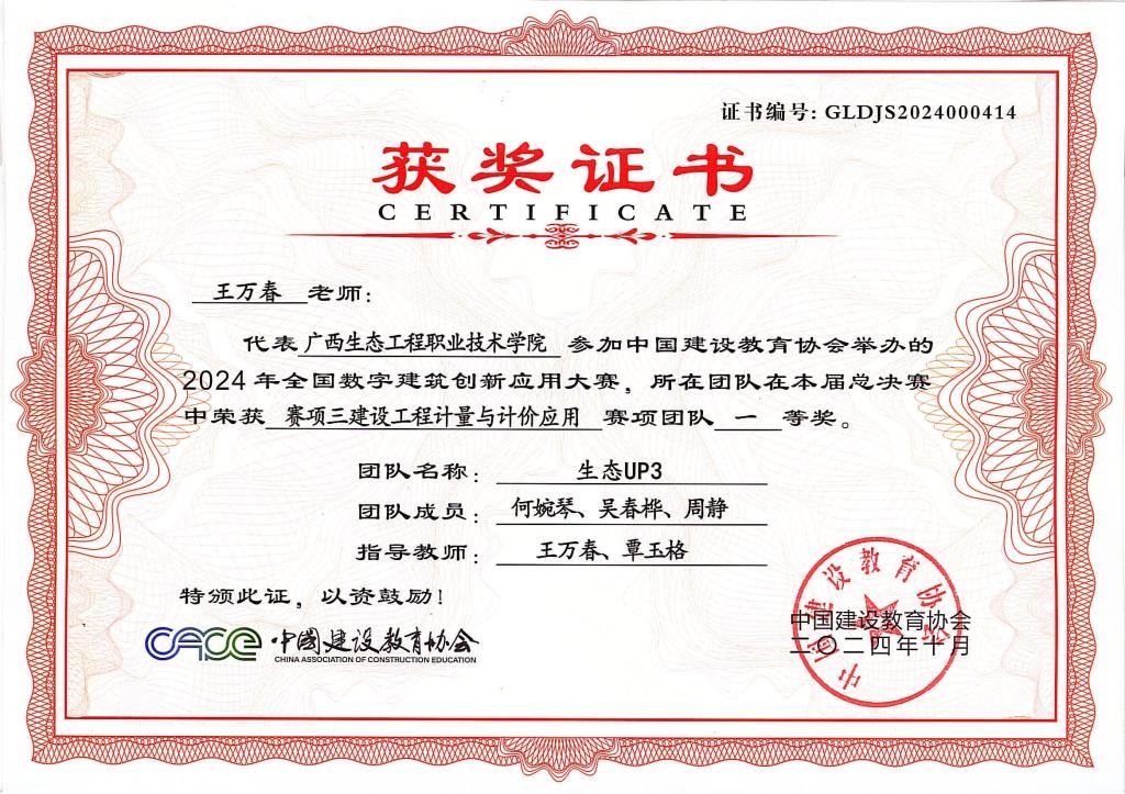 10月19日,由中国建设教育协会举办的“2024年全国数字建筑创新应用大赛”全国总决赛中,我校学子打破历史记录,获建设工程计量与计价应用赛项一等奖,专科组全国排名第一(本科组705个参赛队伍,专科组186个参赛队伍)。