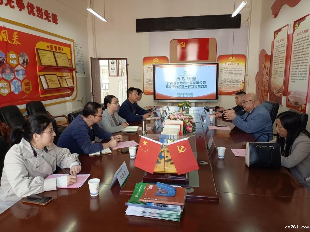 为搭建校企合作良好的沟通平台,激发合作融合点和创新点,2024年11月29日,广西信东地源热泵有限公司邓义宁总经理一行3人来建筑与道桥工程学院交流洽谈。我院党总支书记、院长肖万娟,副院长刘冶敏,建筑工程技术专业负责人姜倬,智能建造技术专任教师谭栋博士、工程造价专任教师邓梨方出席会议。
