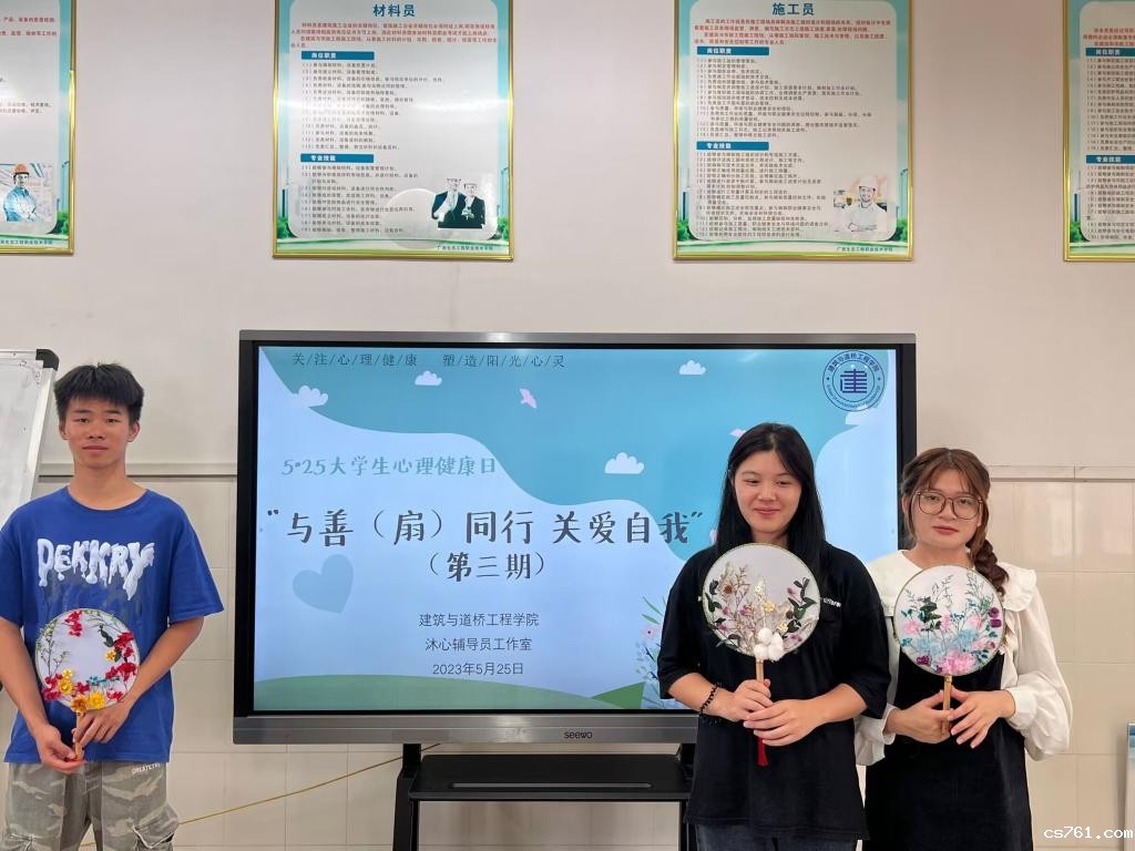 为了引领学生关爱自我、了解自我、接纳自我,进一步普及心理健康知识,树立正确心理健康理念,营造心理健康的氛围,5月25日,建工学院在西区2教313教室开展“与善(扇)同行 关爱自我”第三期——5·25大学生心理健康日主题活动,此次活动由“沐心”辅导员工作室和学院团委承办。