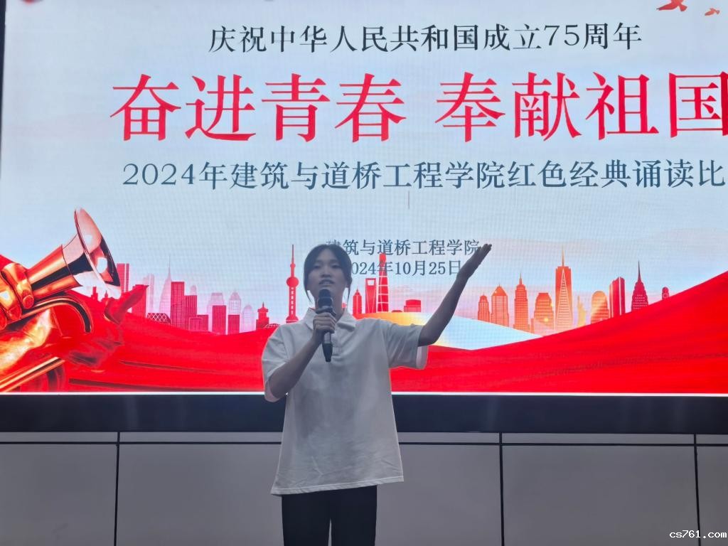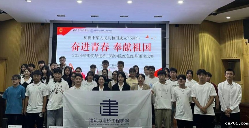 2024年10月25日,建筑与道桥工程学院在学校青山报告厅举行2024年“奋进青春,奉献祖国”红色经典诵读比赛。学院团委书记梁银明、团委副书记李长健,辅导员卢婷薇、李雨珈担任本次比赛的评委。