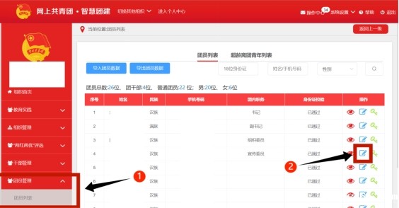 (1)登录“智慧团建”系统后,点击“团员管理-团员列表”菜单,点击编辑个人信息,进入修改页面。