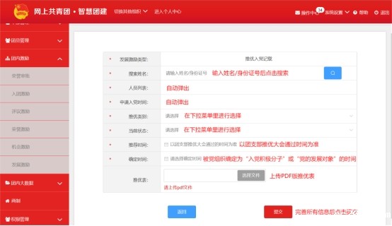 (4)根据提示完善所有信息。在“推荐时间”栏选择,具体时间以团支部推优大会通过的时间为准。在“确定时间”栏选择,具体时间应为推荐人选被党组织确定为“入党积极分子”或“党的发展对象”的时间。如推荐人选尚未被党组织确定,则“确定时间”栏不用填写。