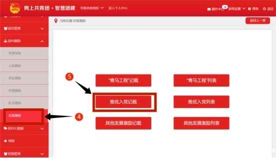 (3)点击“团内激励-发展激励”菜单,选择“推优入党记载”进入默认界面。